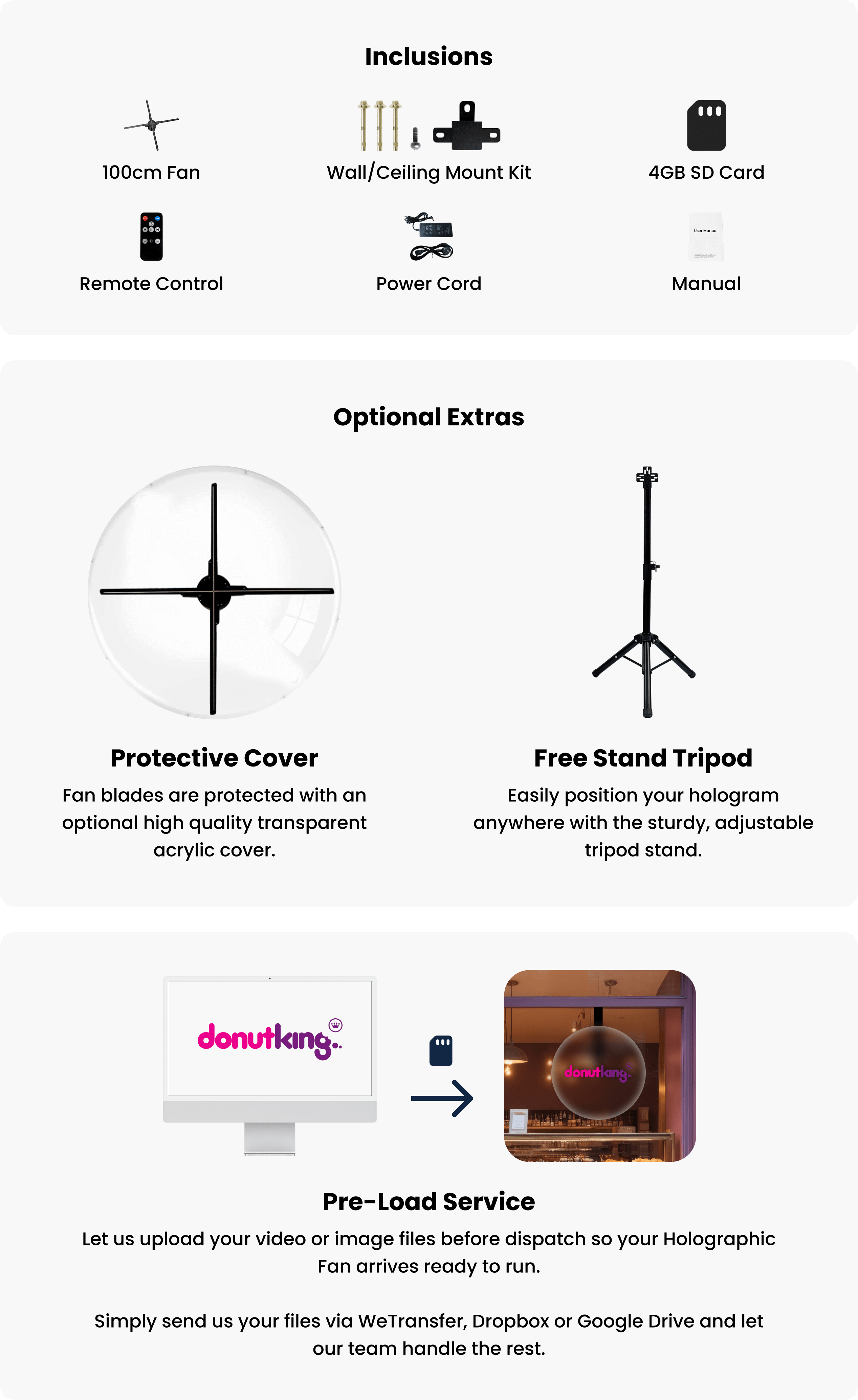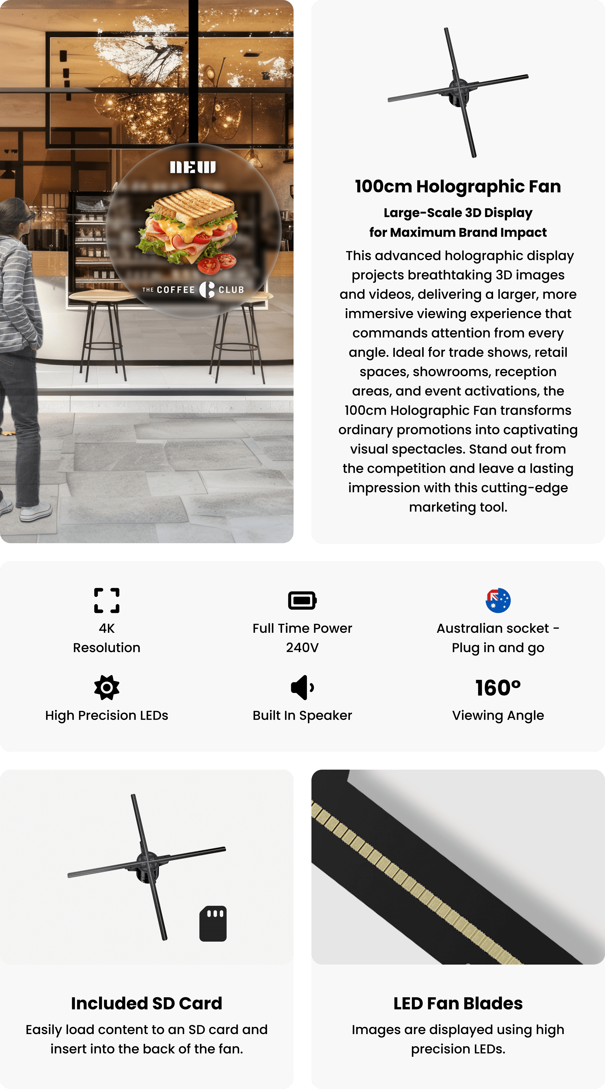 Get your brand noticed with the 100cm Holographic Fan, a powerful 3D display that projects breathtaking holographic images and videos. Designed to create a bold and immersive visual experience, this innovative display transforms your logo, message, or product into captivating holographic motion — guaranteed to draw attention and elevate your brand presence. Perfect for trade shows, retail spaces, showrooms, and event activations, the 100cm Holographic Fan commands attention from every angle and ensures your brand stands out from the competition.