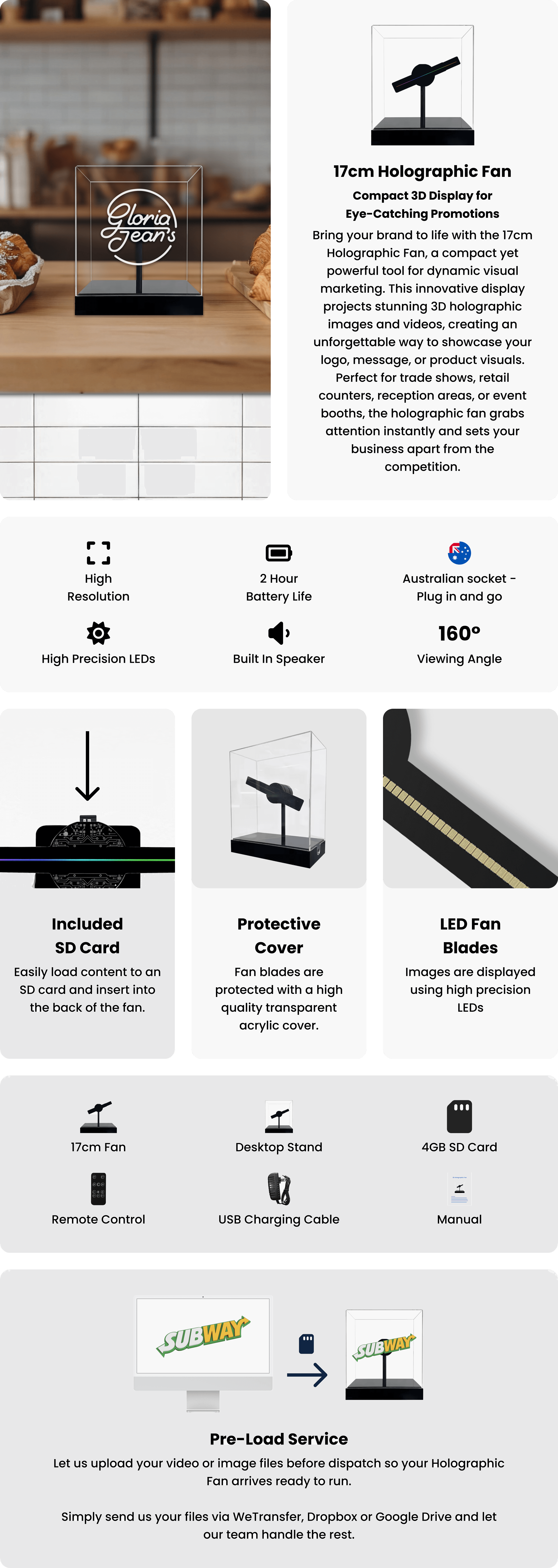 Get your brand noticed with the 17cm Holographic Fan, a compact yet powerful 3D display designed to captivate and engage. This innovative marketing tool projects stunning holographic images and videos, transforming your logo, message, or product into a dynamic visual experience. Perfect for trade shows, retail counters, reception areas, and event booths, the holographic fan instantly commands attention and ensures your brand stands out from the competition.