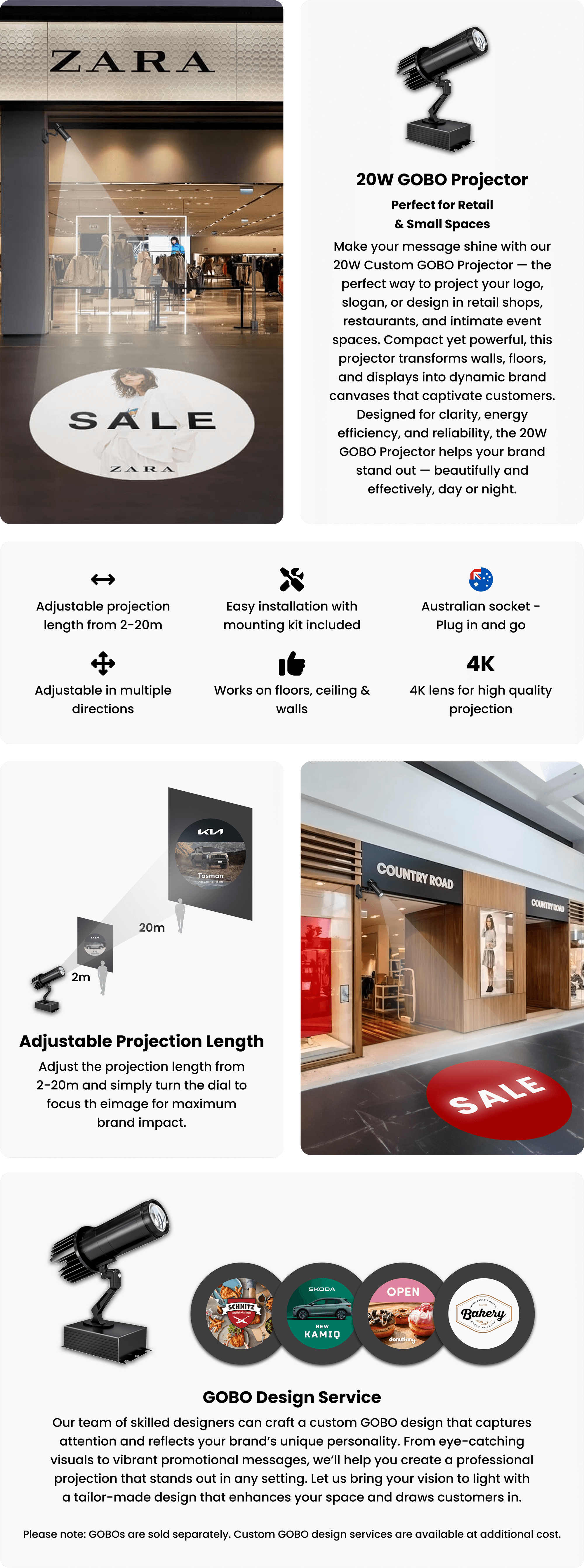 Get your brand noticed with the 20W Custom GOBO Projector — the perfect solution for projecting your logo, message, or design in retail spaces, restaurants, and intimate event settings. Compact yet powerful, this projector transforms ordinary surfaces into captivating brand canvases, ensuring your message shines day or night.