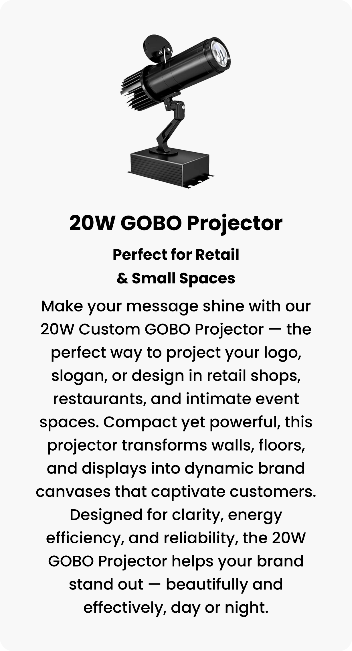 The 20W Custom GOBO Projector — the perfect solution for projecting your logo, message, or design in retail spaces, restaurants, and intimate event settings. Compact yet powerful, this projector transforms ordinary surfaces into captivating brand canvases, ensuring your message shines day or night.