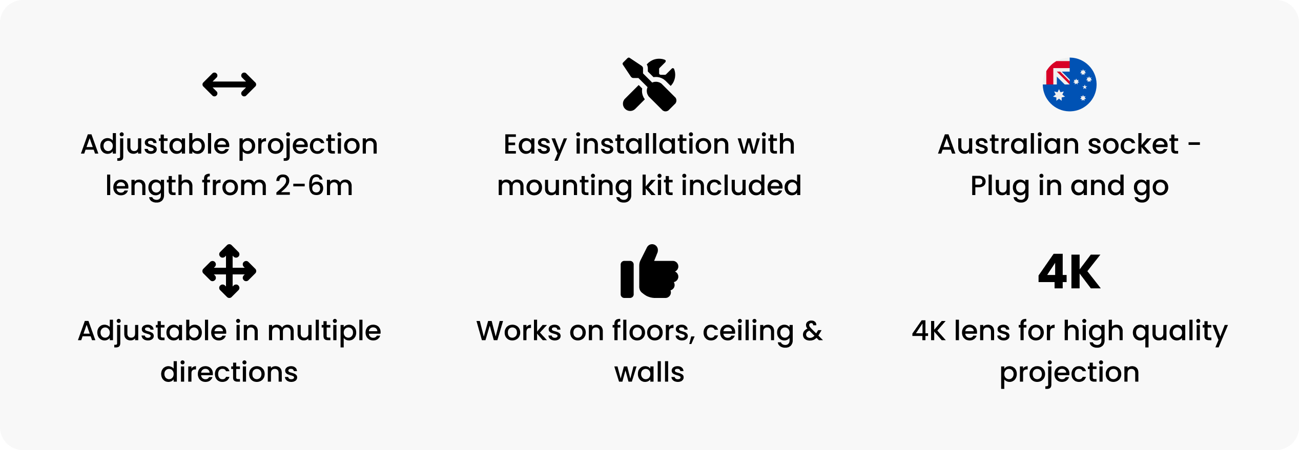 Easy Installation - Comes with a full mounting kit and standard Australian plug — simply plug in and project.