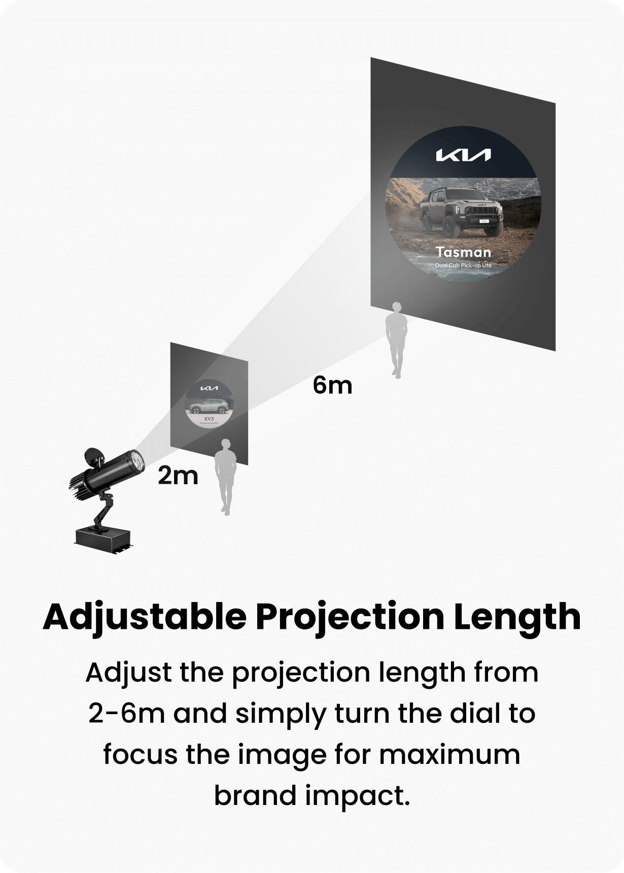 Adjustable Projection Length of 2–6m (up to 12m in a completely dark environment) - Easily adjust the focus for the ideal projection distance, ensuring crisp visuals and maximum impact in any environment.